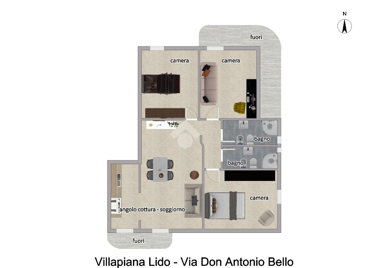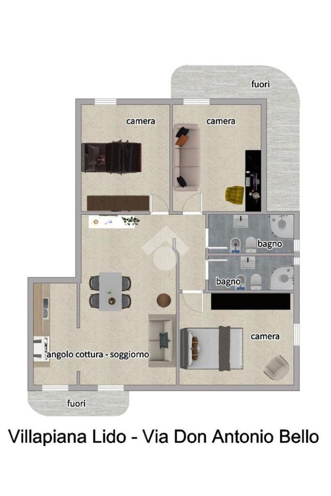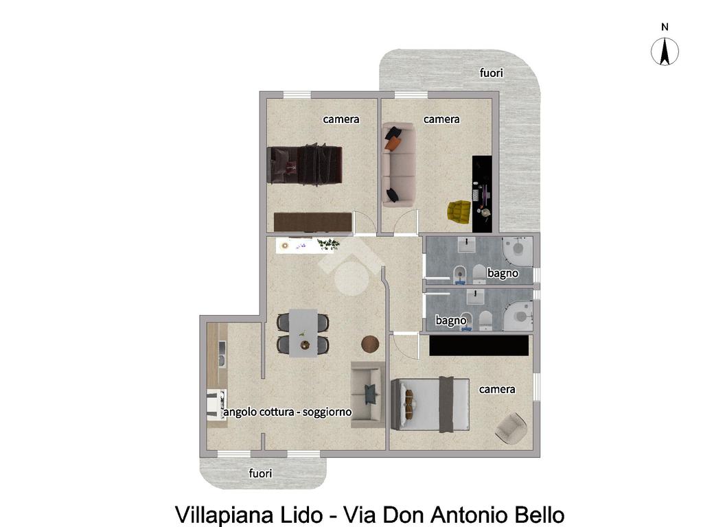 La soluzione offre una metratura comoda e ben distribuita: ingresso in soggiorno, cucina, tre camere da letto e due bagni.
