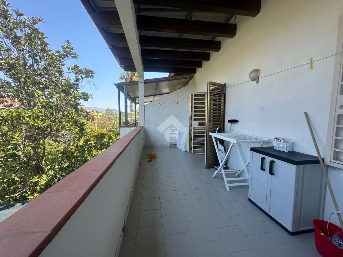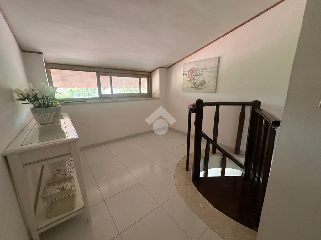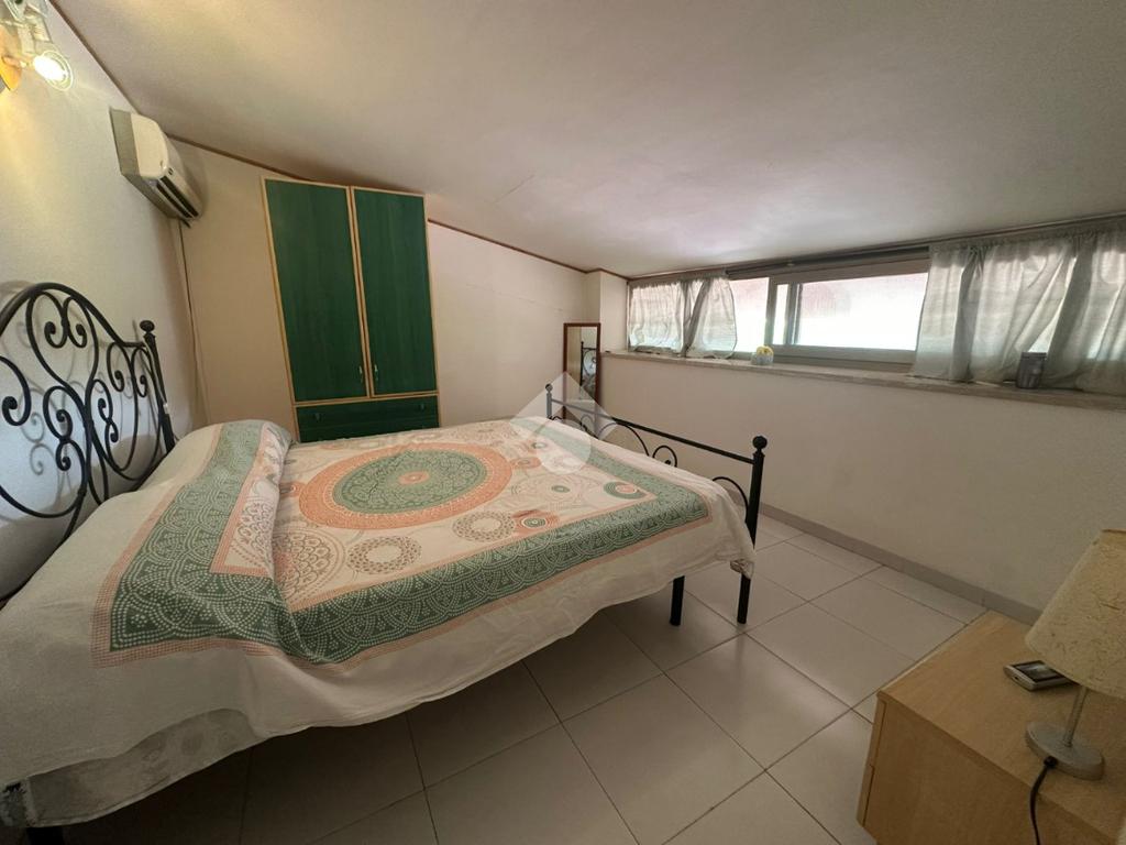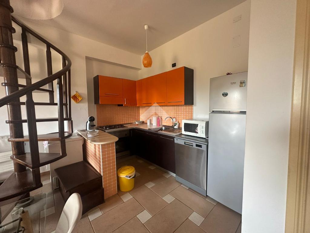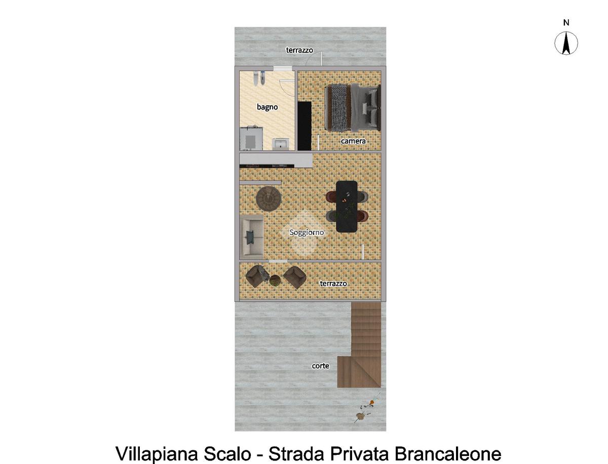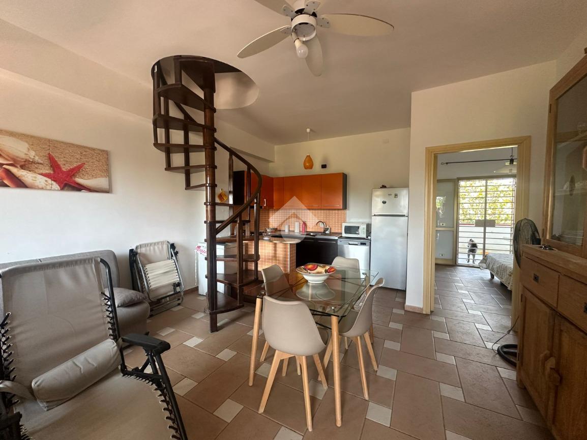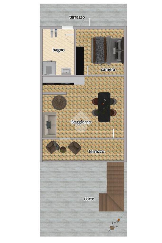 L'ingresso si apre su un luminoso soggiorno con angolo cottura, e la zona notte del piano ospita una camera matrimoniale con bagno privato e accesso diretto a un secondo terrazzo.