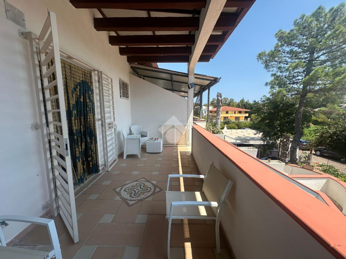 Attraverso una scala esterna si accede al primo piano, dove veniamo accolti da un terrazzo comodo, perfetto per colazioni all'esterno.